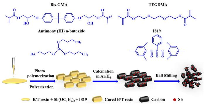 Despite the success of the strategies in our previous work, no material based on alloying lithiation reaction has been synthesized with this concept. In this work, we demonstrate the feasibility of synthesizing antimony/carbon hierarchical micro-/nanohybrids using difunctional methacrylate monomers (Bis-GMA and TEGDMA) as a reaction medium and carbon source (Scheme 1). The liquid antimony(III) n-butoxide is used as the precursor of Sb, which is well mixed with the methacrylate resin solution. The fast photo polymerization process allows the methacrylate monomers to instantly polymerize. As a result, the antimony species are homogeneously integrated into the cross-linked methacrylate network at a molecular level. After calcination in argon/hydrogen atmosphere, the Sb nanoparticles are in situ formed due to carbothermal reduction and embedded homogeneously in the in situ formed carbon matrix. Consequently, the growth and agglomeration of the antimony nanoparticles are limited, which helps to elevate the impact of the volume change on the cyclic stability of the antimony based anode. Furthermore, the carbon matrix surrounding the antimony nanoparticles helps to withstand the volume expansion of the antimony nanoparticles and absorb the mechanical stress generated by the volume change. By combining the approaches of morphology control, spatial dispersion, and compositing with carbon matrix, the electrochemical performance of the antimony based anode is expected to be improved.