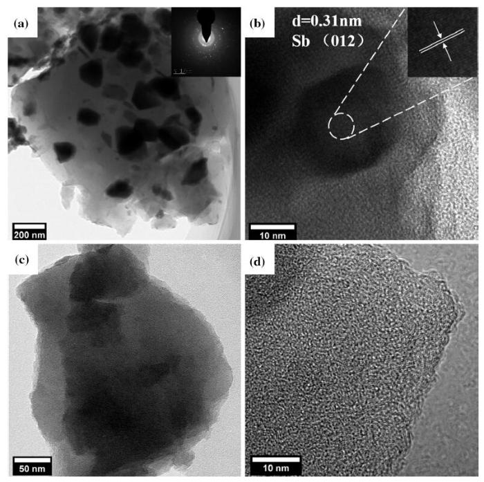 Fig. 2 TEM images of the Sb/C micro-/nanohybrid a, b, pure carbon c, d. Inset: SEAD pattern (in a) and local crystal plane of the antimony particles (in b) .