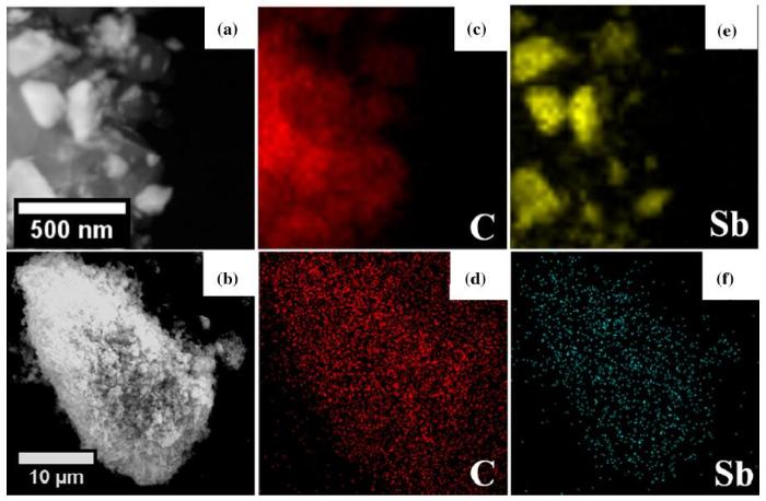 Furthermore, the spatial distribution of the antimony species in the area of with different sizes is characterized by both STEM and EDX. The STEM (Fig. 3a, c, e) prove the embedding of the antimony nanoparticles within the carbon matrix in a region with a dimension of 1000 nm × 1000 nm. It can be found that the antimony species is also homogeneously dispersed in carbon matrix in a large size scale area (around 30 μm×30 μm), as shown by the EDX images (Fig. 3b, d, f). It is known that the spatial resolution of the EDX technique is lower compared to the size of the antimony nanoparticles revealed by TEM. However, it is reasonable to tell that the antimony nanoparticles are homogeneously embedded in the carbon matrix by combinating the imaging analysis of both the STEM and EDX.