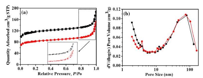 Fig. 5 Nitrogen adsorption-desorption isotherms a, corresponding pore size distribution b of the Sb/C micro-/nanohybrid (red) and pure carbon (black) .