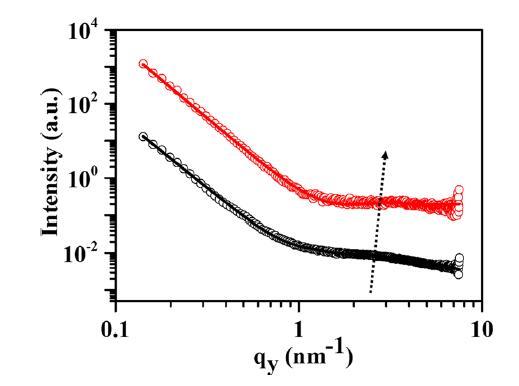 Fig. 6 Small angle X-ray scattering (SAXS) profiles of the Sb/C micro-/nanohybrid (red) and pure carbon (black) .