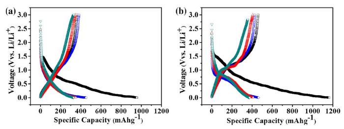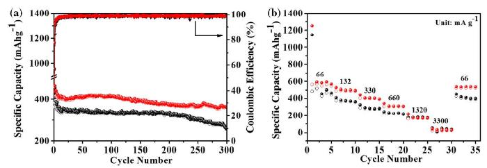The rate performance and cyclic performance of the assembled coin cells were tested using a multichannel Land Battery Test System. The rate performance was measured at the current density sequence of 66, 132, 330, 660, 1320, 3300 and 66 mA g-1 in a voltage range between 3.0 and 0.005 V (vs. Li/Li+ or Na/Na+) (five cycles at each current density). The cyclic measurement was carried out at a current density of 66 mA g-1 in the voltage range of 3.0-0.005 V (vs. Li/Li+) for 300 rounds or in the range of 3.0-0.005 V (vs. Na/Na+) for 100 rounds. The specific capacity was calculated on the basis of the active material only. The lithiation/sodiation and delithiation/desodiation processes were indexed as the discharge and charge processes respectively. A CHI 1040B potentiostat/galvanostat analyzer (Shanghai Chenhua instrument Co., Ltd.) was used to carry out cyclic voltammetry test at a scanning rate of 0.01 mV/s with the voltage range between 0.005 and 3.0 V.