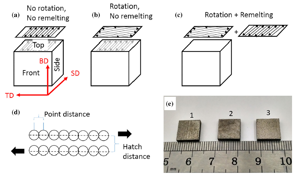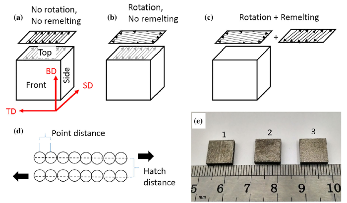 Fig. 2 Schematic illustration of scanning strategies of a no scanning rotation, no remelting, b scanning rotation, no remelting, c scanning rotation and remelting, d illustration of pulse laser mode, e picture of pure tungsten bulks manufactured under scanning strategies (1)-(3) in order from left to right (BD: building direction; SD: laser scanning direction; TD: transverse direction)