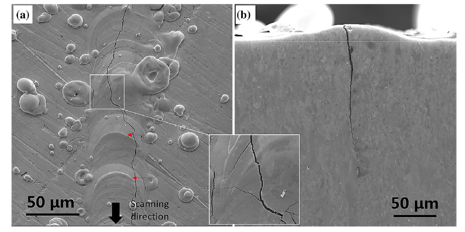 In the future, measures should be undertaken from the respects of both cracking driving force and resistance to control cracking. Considering the stress is caused by thermal mismatch, substrate preheating has been proven to be an efficient method to reduce the residual stress and control cracks in SLM as mentioned in Ref. [26, 27, 39]. The cracking resistance is mainly determined by its plastic deformation at the crack tip, which can be improved by an alloying approach as mentioned in Ref. [24, 25, 32].