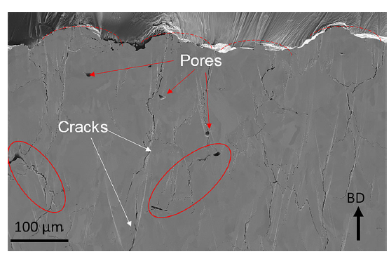 On the side face, it can be observed that the cracks grow deep into several layers (thickness 30 μm in this study), indicating that they can affect several layers. Owing to insufficient overlapping of the molten track [30], some residual pores can be observed as shown by red arrows in Fig. 5. As mentioned in Ref. [6], the pore defects may nucleate cracks as indicated by the red circles in Fig. 5. A crack network can be observed with a spacing of ~ 100 μm, which is equal to hatch distance, in tungsten fabricated via laser AM.