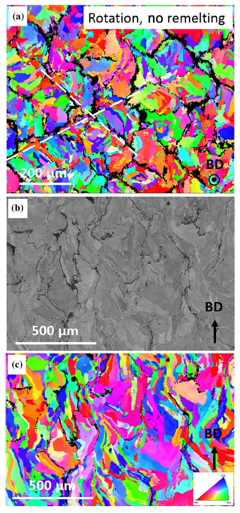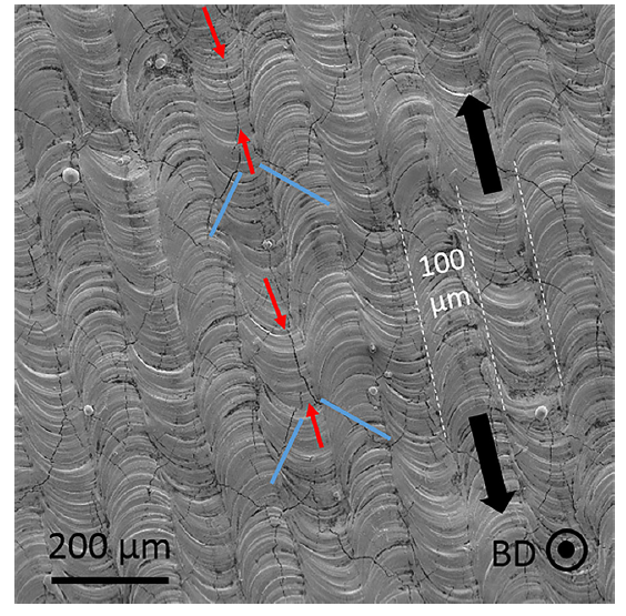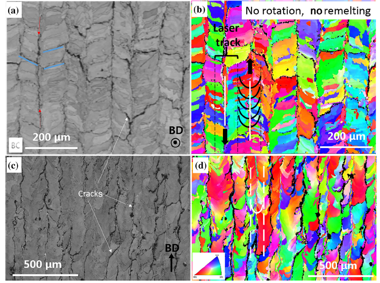 (2)The scanning rotation could contribute to crack control, particularly for longitudinal cracks, because it could intertwine the GB structure and increase the crack growth resistance. The remelting could disturb the grain growth and change the crack pattern, but could not suppress the cracking.