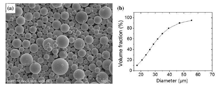 Spherical powders (purity > 99.9%, median diameter = 28 μm) were used in this study as shown in Fig. 1. The powders were spheroidized using a plasma spheroidization machine (Teksphero-40, Tekna Co. Ltd, Sherbrooke, Canada) as described in Ref. [29].