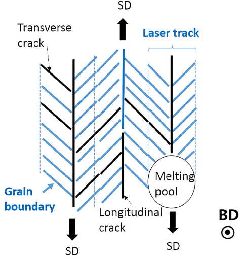 The formation of longitudinal and transverse crack patterns (Fig. 4) can be ascribed to the characteristic microstructure after the SLM process. As illustrated in Fig. 10, in the melting pool, liquid becomes solidified along the temperature gradient in a directional manner, forming the slender grains (also shown in Fig. 7b). The slender grains meet together in the center of the molten track, forming the longitudinal GBs. The longitudinal and transverse GBs (blue lines in Fig. 10) eventually act as the growth paths of cracks (black lines). When the SD was rotated between layers, the grains were partially disordered as shown in Fig. 8a; therefore, the longitudinal cracks became shorter, whereas the transverse cracks retained the same pattern. The remelting disturbs the grain arrangement on the top face. Consequently, the surface crack is demonstrated to be irregular (Fig. 9a).