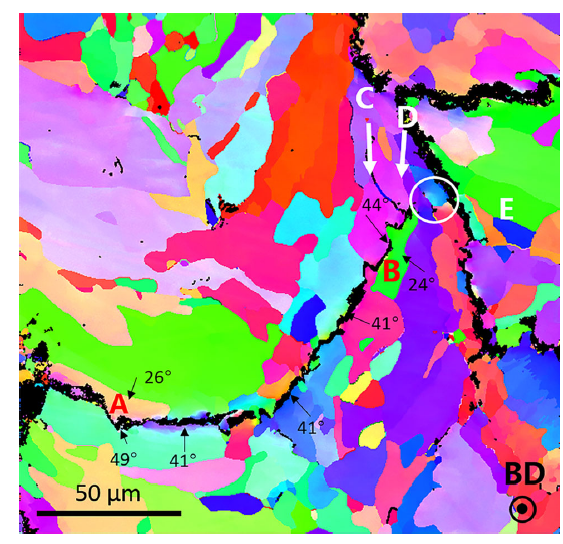On the front face (Fig. 7c), the cracks grow along the BD and the crack can be elongated over 1 mm. From the IPF mapping (Fig. 7d), it can be observed that the columnar grains induced by directional solidification grow along the BD. The columnar grains are almost parallel to each other, forming the vertical GBs along the BD. In fact, the columnar grains are formed via two adjacent laser scans in one layer. The dash white line pairs indicate the supposed position of the laser track, whereas the semicircle indicates the boundary of the melting pool. Inside the laser melting pool, the grains grow in a direction normal to the semicircle. Eventually, the grains encounter each other at the center of the melting pool, forming the vertical GB, which provides the growth path for cracks. Combined with the morphology of the top face (Fig. 7b), it can be predicted that the columnar grains are plate-like structures.