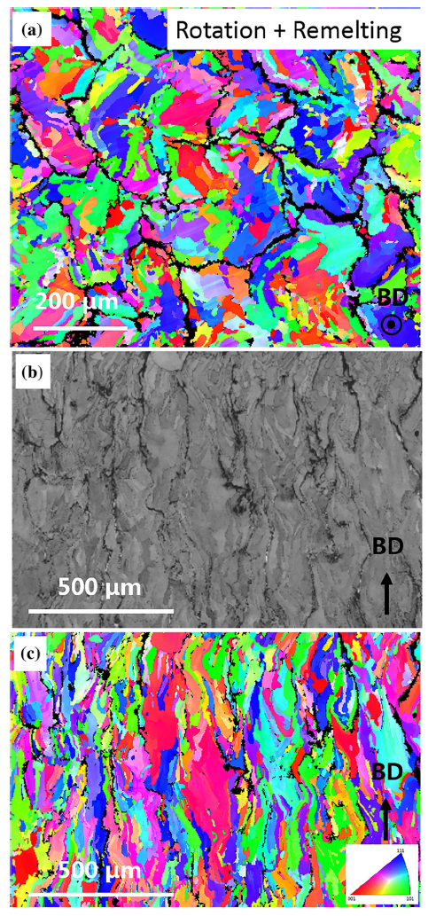 On the side face, directional columnar grains were observed when the SD was fixed (Fig. 7b, c) under the directional solidification mechanism. The vertical GB structure led to vertical cracks, with spacing of 100 μm (hatch space) between them. When the SD was rotated between layers, the melting pool was more likely to cover the GBs of the previous layer; therefore, the epitaxial growth was broken and columnar grains became intertwined. The intertwining of the GB structure can contribute to the control of the crack because cracks would encounter more growth resistance (Fig. 8b, c). When the parts are melted twice, the columnar grains can still be observed. However, remelting cannot suppress the cracks (Fig. 9b, c) because the cracks can penetrate the deposition layers.