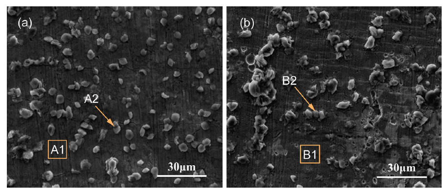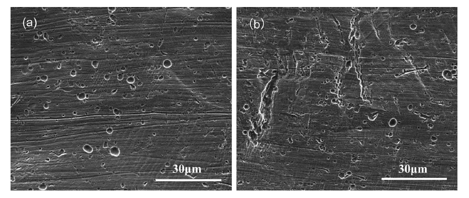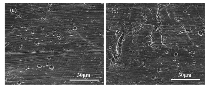 Figure 3 shows scanning electron microscope (SEM) micrographs of the surface morphologies of non-arcing parts after soaking for 720 h in lead-containing and lead-free solutions. There are two kinds of corrosion products—particulates and a relatively dense film. Small cracks can be observed on the film in both solutions, while they are more obvious in lead-containing solution. In order to observe the corrosion conditions of the 316LN stainless steel under the film, the corrosion products were removed from the samples surface.