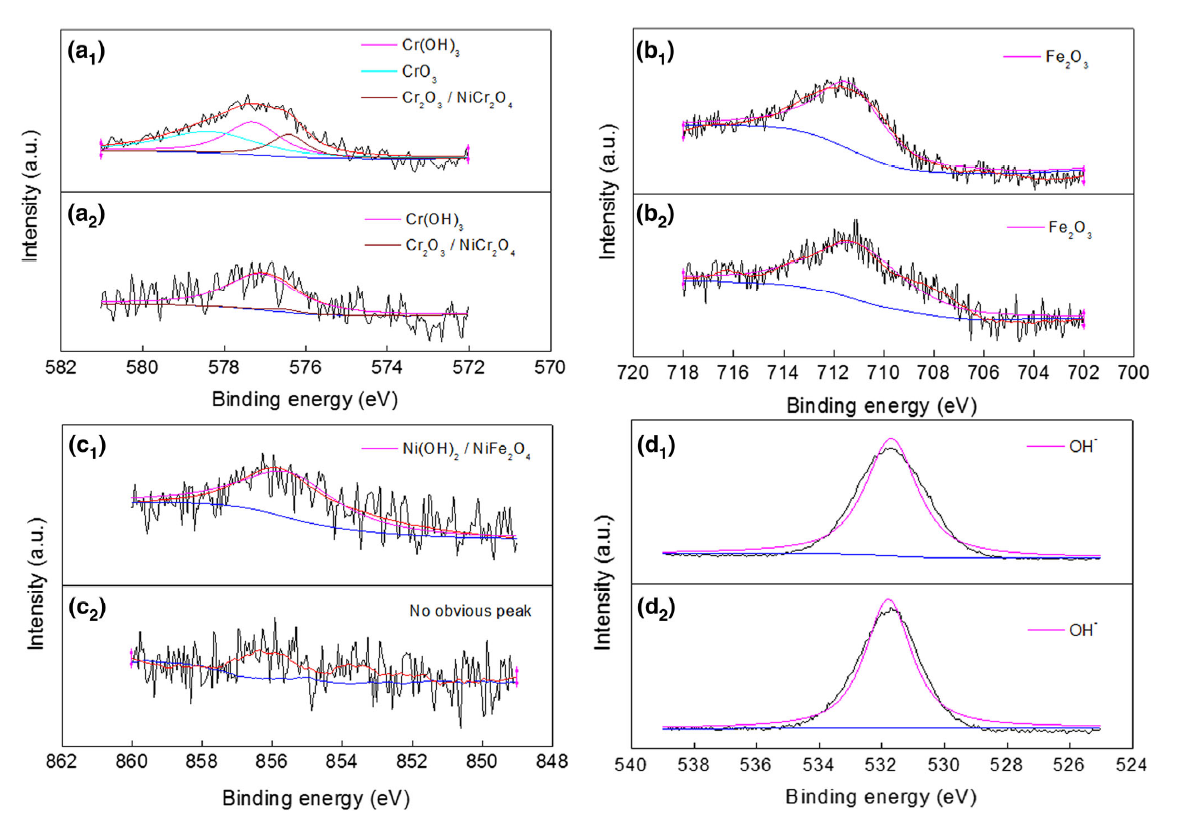 Figure 5 shows the XPS spectral of the corrosion products under the two conditions, in which a(1,2), b(1,2), c(1,2) and d(1,2) correspond to the peaks of Cr 2p3/2, Fe 2p3/2, Ni 2p3/2 and O 1s, respectively [35, 36, 37]. The spectra in Fig. 5a1 show three peaks that correspond to electron binding energy of 576.4 eV, 577.3 eV and 578.4 eV, which indicate that chromium exists in a form of Cr2O3 or NiCr2O4 (a spinel structure that has similar electron binding energy to Cr2O3), Cr(OH)3 and CrO3 in the lead-free condition. However, the electron binding energies of the two peaks shown in Fig. 5a2 correspond to 576.5 eV and 577.1 eV. It can be seen that Cr(OH)3 is the main form, and the contents of Cr2O3 or NiCr2O4 and CrO3 are low in the lead-containing condition. The spectra in Fig. 5b1, b2 both show one peak, which correspond to electron binding energies of 711.4 eV and 711.0 eV, respectively. The observation of a single peak indicates that iron predominantly exists in a form of Fe2O3 under both conditions. Figure 5c1 shows one peak corresponding to electron binding energy of 855.5 eV, which indicates that nickel exists in a form of Ni(OH)2 or NiFe2O4 in the lead-free condition. Meanwhile, no obvious peak in Fig. 5c2 reveals that the content of Ni is low in the lead-containing condition which is consistent with Table 3. Figure 5d1, d2 both exhibit a single peak corresponding to electron binding energies of 531.7 eV and 531.8 eV, respectively, indicating that the oxygen exists mainly in a form of OH- under the two conditions.