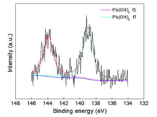Figure 6 shows the Pb 4f XPS spectra of the sample from the lead-containing solution. The two peaks with electron binding energies of 138.9 eV and 143.9 eV correspond to Pb(OH)2 (f5) and Pb(OH)2 (f7) or PbO. However, in combination with the XPS spectra of O 1s, it can be confirmed that these two peaks correspond to Pb(OH)2 (f5) and Pb(OH)2 (f7), respectively, caused by the splitting of Pb 4f.