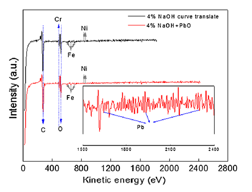 The results of the EDX, XPS and AES analysis show that in high-temperature lead-containing solution, the thickness of the oxide film on 316LN stainless steel is significantly increased, and the contents of Fe, Cr and Ni are reduced, and Cr and Ni exist mainly in the form of hydroxides comparing with lead-free condition. The presence of the hydroxide decreases the stability of the film, increases the corrosion sensitivity and reduces the ratio of Cr2O3 to spinel oxide, which have protective effects on the matrix [13, 14].