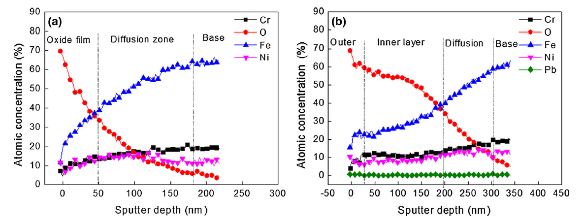 As illustrated in Fig. 8, the oxide film formed in the lead-containing environment contains a small amount of lead, and there is no obvious distribution of Cr and Ni on the surface, which is consistent with the results shown in Figs. 5 and 6. Compared Fig. 9a with b, there are significant differences in the thickness of the oxide film and the depth distribution of the main elements between the two conditions. According to the tendencies of Ni, Cr and Fe, we defined the oxide film into the inner and outer film. In outer film, the contents of Fe and Cr increased and that of Ni decreased slightly, while the contents of the three elements were relatively stable in inner film [4, 45, 46, 47, 48]. Overall, the outer layer of the film is rich in Fe-Ni and the inner layer is rich in Cr, which are related to the diffusion rate of the elements in the oxide [18, 19]. However, the film generated in the lead-free environment is approximately 50 nm thick, and there is no obvious double-layer structure, while the film from the lead-containing environment is approximately 200 nm thick with a double-layer structure. The outer layer is similar to the surface structure formed in the lead-free condition, and the contents of Fe and Cr in the inner layer are equivalent to those in lead-free condition, which are around 20-40% and 12%, respectively. However, the Ni content dropped from 12 to 8%.