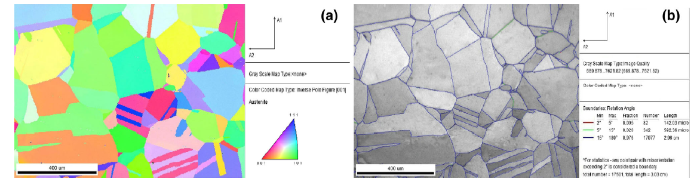 Figure 2 shows the microstructure of the material determined by electron backscattered diffraction (EBSD). The maps show that the 316LN stainless steel used in this work is a single-phase austenite structure with a large number of annealing twins and the average grain size is 177 μm.