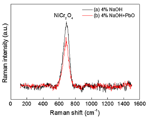As indicated by the results of XPS, some substances, such as Cr2O3 and NiCr2O4, Ni(OH)2 and NiFe2O4, cannot be distinguished due to the similarities in their electron binding energies. To further determine the composition of the film, Raman spectroscopy analysis was performed. A strong peak at 684 cm-1 can be observed on the Raman spectra in both solutions, which corresponds to the strong characteristic peak of NiCr2O4 [31, 38, 39, 40, 41], as shown in Fig. 7. However, in the presence of lead, the peak intensity of NiCr2O4 is obviously lower than the lead-free conditions. These results show that the main component of the spinel structure in the film of 316LN stainless steel is NiCr2O4, but the presence of lead can destroy the conversion equilibrium and inhibit the formation of the oxide and spinel structures of Ni and Cr.