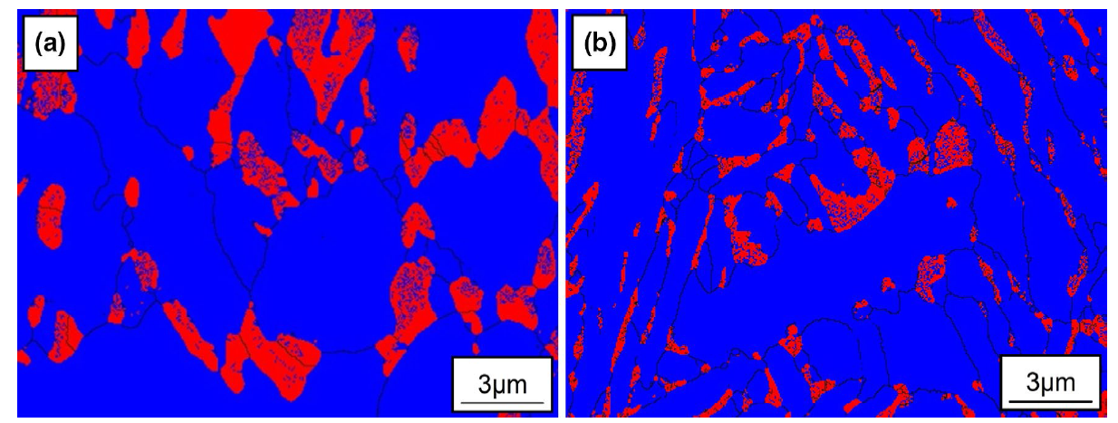 Figure 5 presents the distribution, morphology and size of retained austenite in samples A and B. The red colored regions represent retained austenite, while the blue ones represent ferrite or bainite. From Fig. 5, the different morphologies of retained austenite can be readily observed. In sample A, retained austenite is blocky, while that one in sample B is film-like. Almost all of retained austenite located along the ferrite or bainite grain boundaries regardless of its morphology.