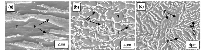 2.Blocky retained austenite contributes to high instantaneous work hardening exponent and ultimate tensile strength due to higher transformation rate of metastable austenite to martensite during tensile deformation.