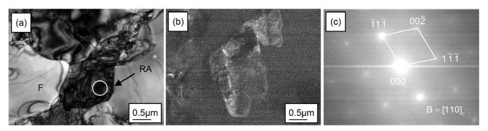 Fig. 3 Representative TEM images of blocky retained austenite in sample A: a bright field image; b dark field image; c SAEDP of blocky retained austenite in circled area in a