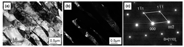 Fig. 4 Representative TEM images of film-like retained austenite in sample B: a bright field image; b dark field image; c SAEDP of film-like retained austenite in circled area in a