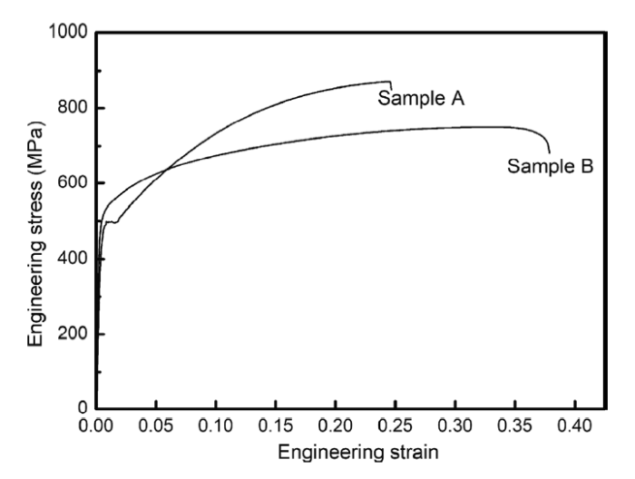 Fig. 6 Engineering stress-strain curves of samples A and B at room temperature