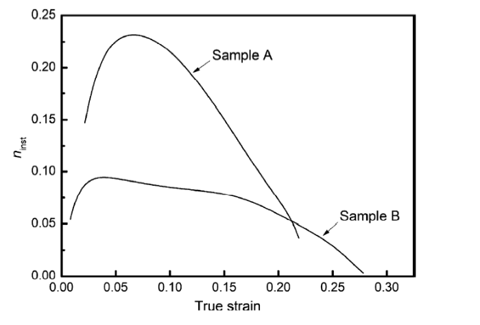 The ninst has been widely used as a parameter of formability in sheet materials [26, 28], where sheet formability increases with increase in ninst. Figure 7 shows ninst values of samples A and B as a function of true strain. ninst of sample A is higher than that of sample B, when the true strain is less than 0.2. ninst of sample A increases steeply in the initial stage of deformation and achieves a maximum value at the strain of 0.07, and then decreases gradually until the necking point. Sample B exhibits a flatter, more sustained work hardening behavior up to the necking point. Therefore, film-like retained austenite can bring about sustained work hardening in TRIP steels.