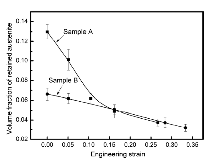 Figure 8 shows the volume fractions of retained austenite in samples A and B as a function of engineering strain. The volume fractions of retained austenite of both samples decrease gradually with an increase in strain due to the continuous transformation of retained austenite to martensite. It can be seen that a large amount of retained austenite of sample A has transformed to martensite during the early stage of deformation. Given that ninst of sample A increases quickly at the initial stage of tensile deformation, it can be concluded that the sharp increase in ninst to the maximum can be attributed to the rapid transformation of retained austenite.