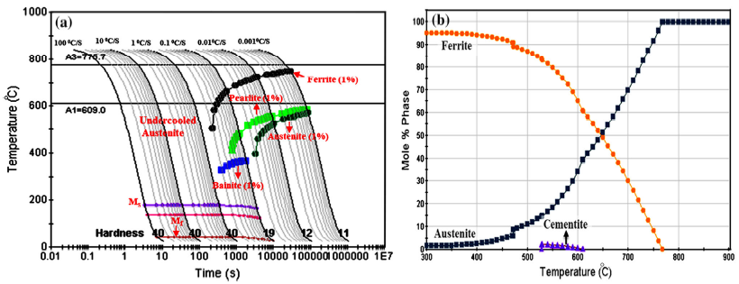 Fig. 10 a CCT diagram, b phase fraction of experimental steel, predicted by JMatpro database