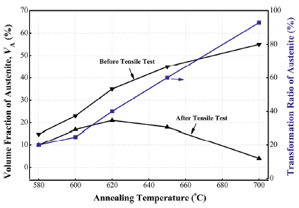 Fig. 3 Measured austenite fraction and transformation ratio for the samples before and after tensile testing at different annealing temperatures