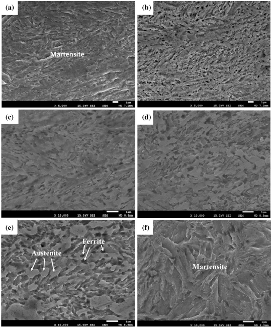 X-ray diffraction (XRD) measurements were performed to identify the coexisting phases in the samples and to determine the austenite fraction by using Shimadzu XRD-6000 diffraction instrument with CuKα radiation and a wavelength of 0.1540562 nm at 40 kV and 30 mA. The samples were scanned from 30° to 100° at a scanning speed of 1°/min. The XRD samples were electrochemically polished in a solution of 5% HClO4 and 95% C2H5OH before measurements to eliminate the effect of mechanical polishing and cutting. The austenite volume fraction (VA) at different conditions was evaluated on the basis of the following equation [31, 32, 33].