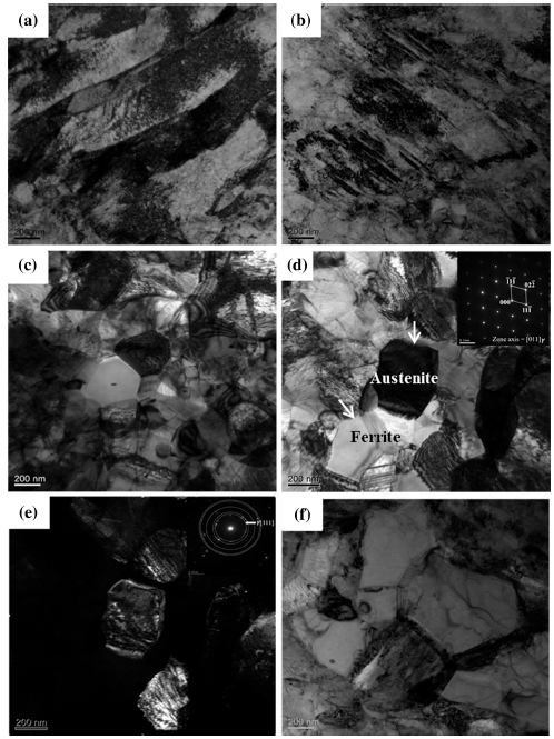 Detailed microstructures of the experimental steels at different conditions are examined by TEM, as shown in Fig. 5. In comparison with the coarse martensite plates of the HRed steel in Fig. 5a, the HWRed steel in Fig. 5b exhibits the refined microstructures with dense tangled dislocations and dislocation cells. The warm rolling can definitely strengthen the undercooled austenite by refining the austenite grains and by introducing a large number of dislocations into it, consequently resulted in the final refinement of the martensite plates [24, 28, 29, 30]. The intercritical annealing was performed to push the inversely transformation of the martensite into austenite. Figure 5c-f demonstrates the typical TEM images of the HWRed steel annealed at 600, 650 and 700 °C, respectively. The equiaxed ultrafine microstructures are clearly observed, and the grain size increased gradually with increasing annealing temperature. According to XRD analysis in Fig. 2 and SEM examination in Fig. 4, these ultrafine microstructures are austenite and ferrite, as indicated by the arrows in Fig. 5d. The inset in Fig. 5d shows the diffraction pattern of austenite phase indicated by arrow. The dark field (DF) and the diffraction rings also proved the presence of equiaxed UFGs of austenite in the structures shown in Fig. 5e. The selected area diffraction (SAED) pattern exhibits the typical continuous rings, which are the characteristics of UFGs [35] separated by boundaries having high angle of misorientation. Furthermore, the UFG austenite and ferrite newly formed by transformation still remain below 500 nm and 800 nm in size at 650 and 700 °C annealing, respectively, indicating considerable thermal stability.
