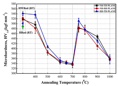 Fig. 6 Variation of microhardness HV values with annealing temperature along ND-TD, ND-RD and RD-TD planes for annealing time of 1 h followed by air cooling