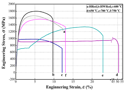 Figure 6 presents the variation of microhardness (HVs) of the annealed HWRed steel along three different planes at various annealing temperatures. The hardness of HWRed sample is improved along all the planes as compared to HRed sample. The change in hardness on different planes is small at a fixed annealing temperature, i.e., HVND-TD ≈ HVND-RD ≈ HVRD-TD, indicating that the mechanical properties of the material are uniform and no obvious anisotropy exists in this steel. The microhardness of the samples decreases as the annealing temperature rises from 400 to 700 °C, which result from the recovery and recrystallization of the deformed microstructures and the soft phase formation of ferrite and austenite. The microhardness has an abrupt increase at 750 °C annealing and then rapidly decreases with annealing temperatures. An abrupt increase in hardness is due to martensite transformation from the nearly fully austenized HWRed steel by annealing near A3 temperature and quenching, while the subsequent decrease in hardness should be attributed to martensite structures coarsening resulting from the grain growth of the prior austenite at higher annealing temperatures. Figure 7 demonstrates the representative tensile stress-strain (σ-ε) curves of studied steels at different conditions. The corresponding yield strength (YS), ultimate tensile strength (UTS), total elongation (TEL) and product of strength and elongation (PSE) values for HRed, HWRed and annealed samples are given in Table 2. The HWRed steel shows an enhancement in both YS and UTS as well as better work hardening ability in comparison to the HRed steel. Annealing treating reduces the strength but increases the ductility and elongation of the HWRed steel to some extent. In particular, the PSE and TEL of the 650 °C annealed steel are about 3 and 5 times higher than those of HWRed steel, respectively, as listed in Table 2. It was found that the HWRed steel at different annealing temperatures exhibits very different tensile behaviors. The HWRed sample annealed at 600 and 650 °C shows a discontinuous yielding phenomenon with large yielding plateau; especially the sample annealed at 650 °C, the yielding plateau maintains almost the entire macroscopic tensile process with a remarkable yield elongation of 51%. Whereas, for the HWRed steel annealed at 700 °C, the tensile curve only presents an obviously large yielding plateau at the initial plastic deformation stage, followed by a rapid work hardening. We believe that these phenomena are principally associated with the austenite formation in reverse transformation.