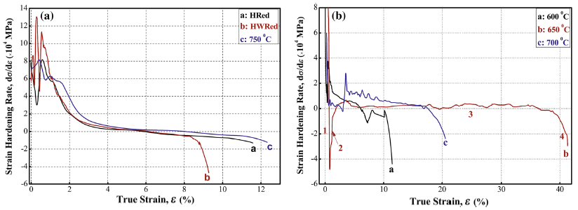 The strain hardening rates (SHR) as a function of true strain for experimental samples containing austenite and no austenite are illustrated in Fig. 8a, b, respectively. It is clear that the SHR decreases monotonically with increasing true strain after fluctuations at the early stage of deformation for all samples (Fig. 8a). The HWRed and 750 °C annealed steel has a higher strain hardening rate than that of the HRed steel. It is evident from Fig. 8b that the samples with higher austenite fraction seem to be higher SHR according to the results from Fig. 3. In addition, on the basis of characteristics of the strain hardening rates and the tensile curves with special yielding phenomenon (Fig. 8b), it can be readily divided into four stages as indicated by 1, 2, 3 and 4 for the curve of 650 °C annealed sample. (Similar scheme is applied to other curves.) The SHR decreases rapidly in the stage 1, and then increases sharply in the stage 2. Some fluctuations are found with unequal amplitudes between the stage 1 and 2 for 700 °C annealed sample. SHR of 600 °C annealed sample slightly decreases in the stage 3, and then increases at about 7% true strain and then decreases again. SHR of 650 °C annealed sample remains almost constant above and near the zero level in the stage 3 with little fluctuations. Similarly, SHR of 700 °C annealed sample decreases with large number of fluctuations above the zero level in the stage 3. It is believed that all of these changes are directly related to the austenite, which will be discussed later.