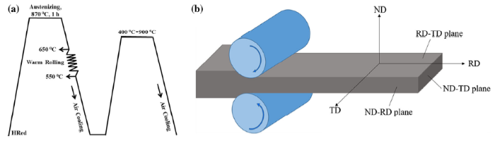 The material investigated in this study is hot-rolled steel provided by Baosteel Research Institute, China. The chemical composition of the steel is given in Table 1. The as-received plate with a thickness of 20 mm was firstly austenized at 900 °C for 1 h and hot rolled (HRed) into 6.5 mm in thickness by five passes with a reduction of 67.5% followed by quenching. The obtained steel was cut into small plates with a dimension of 120 mm in length and 20 mm in width. The small plates were annealed at 870 °C for 1 h, air-cooled to 650 °C and then further heavily warm rolled (HWRed) to a thickness of 1.95 mm with a reduction ratio of 70% by 2 passes. The finishing HWR temperature was 550 °C and then followed by water quenching. The HWRed steel samples were annealed at 400, 500, 550, 580, 600, 620, 650, 700, 750, 800 and 900 °C for 1 h, respectively, followed by air cooling to room temperature (RT). The schematic diagrams of HWR processing and orientations of warm-rolled samples are as illustrated in Fig. 1a, b, respectively. The rolling, the normal and the transverse directions of the HWRed plates are abbreviated as RD, ND and TD, respectively.