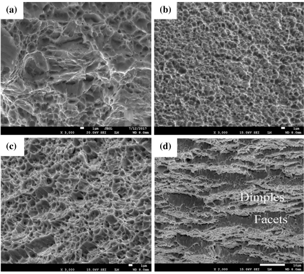 Figure 9 displays the SEM images of the fracture analysis of low-C medium-Mn steel. It is obvious that the failure of all the specimens mainly exhibits ductile characteristics with dimples. Comparably, the dimples’ size of HRed sample is larger than those of other samples. A uniform distribution of the dimples can be observed throughout the fracture surface of HWRed and HWRed steel annealed at 650 °C due to the presence of UFGs. Beside of most of ductile dimples, some cleavage facets are also observed in the HRWed steel and the 700 °C annealed steel, as shown in Fig. 9a, d, implying that the steels present some degree of brittleness although the main fracture mode is dominantly ductile. The 650 °C annealed sample shows bigger and deeper surface inside the dimples in comparison with other samples, confirming the more ductile behavior of this sample. The fracture mechanism is believed to be the martensitic cracking during straining for HRed and HWRed samples, whereas it is less frequent in the case of 650 °C and 700 °C annealed samples because voids are formed primarily at the ferrite-austenite interface, and distributed uniformly until the fracture occurs. Furthermore, the transgranular fracture was observed in all of these samples, which is associated with the dimples.