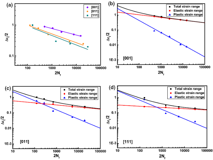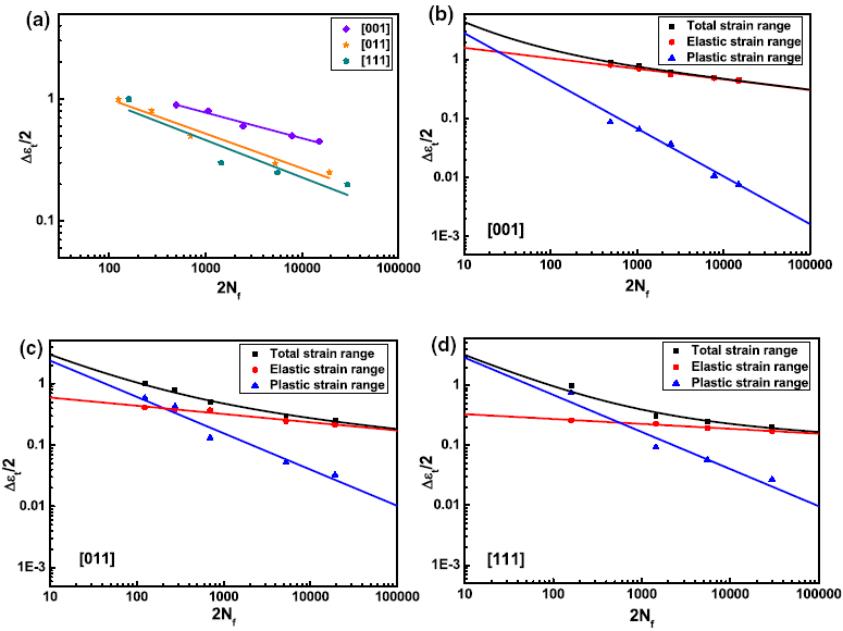 The fatigue life curves of the specimens with the [001], [011] and [111] crystal orientations at 980 °C are illustrated in Fig. 1a. It is noted that fatigue life of strain-controlled low-cycle fatigue is highly orientation dependent, and the [001] specimens show the longest fatigue life, while the [111] specimens have the shortest fatigue life. Besides, the curves of the total, elastic and plastic strain range versus the number of cycles to failure in the [001], [011] and [111] specimens are plotted in Fig. 1b-d. These curves are described by Manson-Coffin equation [22, 23] which is expressed as follows: