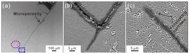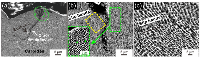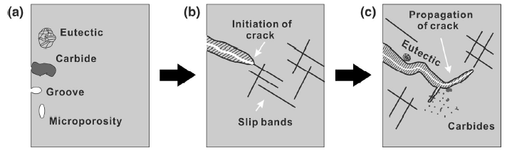 For the [111] specimens after fatigue, SEM observations of the secondary crack in the longitudinal section are shown in Fig. 11. At the junction of different slip planes, the secondary crack is easily generated and mainly propagates along single slip plane, as shown in Fig. 11a. Moreover, the crack tip connects nearby microporosities and eventually propagates parallel to the current cracking direction. Additionally, when the crack encounters carbides, the change in the propagation direction (Fig. 11b) or penetration of the carbide (Fig. 11c) depends on the local stress intensity factors at the crack tip and the strength of the carbide [3]. The carbides in Fig. 11b are large and concentrated in the lower right, resulting in local stress concentration that promotes crack growth toward the matrix. However, in Fig. 11c, fine carbides that are not completely connected have less resistance to cracking but can be easily oxidized. Under cyclic stress, the destruction of the oxide films on the surface reduces the strength of carbides and facilitates cracking through carbides [27].