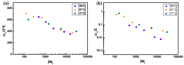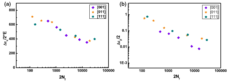 where ΔεeΔεe and ΔεpΔεp are the elastic and plastic strain ranges, respectively, NfNf is the number of cycles to failure, σ′fσf′ is fatigue strength coefficient, ε′fεf′ is the fatigue ductility coefficient, b is the fatigue strength exponent, c is the fatigue ductility exponent, and E is Young’s modulus. Under all testing strain levels, plastic deformation in the [001] specimens is far less than elastic deformation and decreases as the fatigue life increases. It is considered that the fatigue tests with the [001] orientation are dominated by elastic deformation at 980 °C. Nevertheless, the proportion of plastic deformation in the [011] and [111] specimens is much larger than that of the [001] specimens, the impact of which on fatigue tests cannot be ignored.