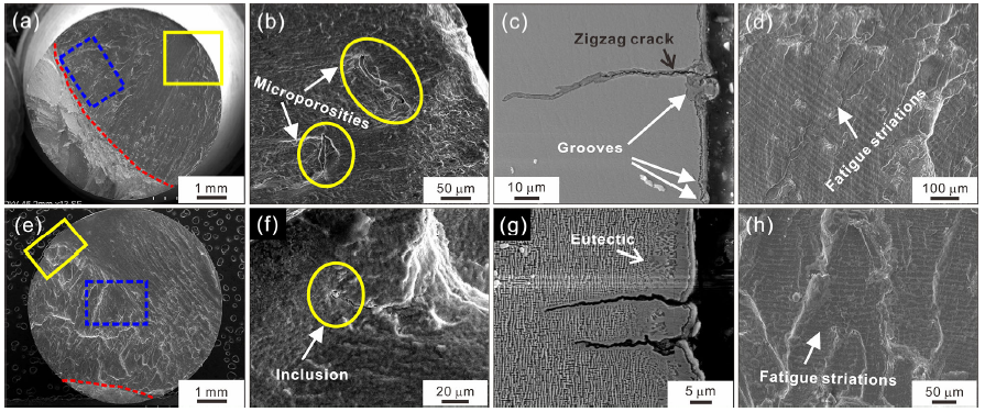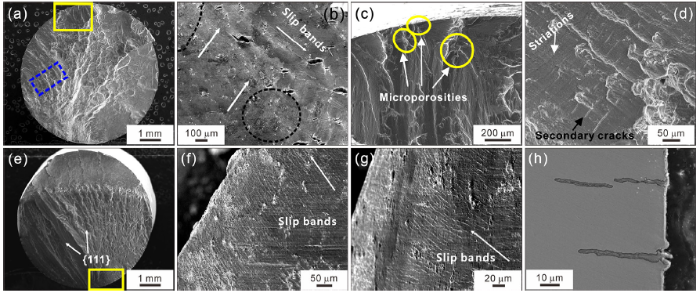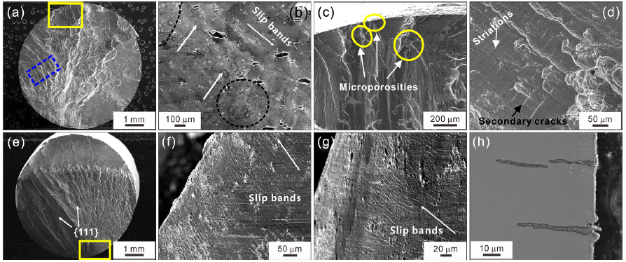 Figure 3 illustrates the fracture morphology of the [001] specimens under higher and lower strain range at 980 °C, respectively. The crack initiates from the casting microporosity or the inclusion at the specimen subsurface (Fig. 3a, e), and high magnification of the crack initiation sites is shown in Fig. 3b, f. Apart from this, the surface oxide layers near grooves and eutectics are another main crack initiation source due to serious oxidation at 980 °C, which is shown in Fig. 3c, g. Figure 4 indicates the octahedral slip planes of the [001] specimens. However, the overall appearance of the fracture surface is perpendicular to the stress axis, which indicates that the [001] specimens deform in wave slip mechanism and fracture along non-crystallographic plane at 980 °C. Apart from that, a considerable oxidation covers the surface slip so that the surface slip is barely detectable at elevated temperature. Besides, it is clearly observed in Fig. 3d, h that directional fatigue striations appear close to the fatigue step of final rupture region. When the stress at the crack tip exceeds the critical point, the final quasi-cleavage fracture rapidly breaks out. Moreover, with the increase in the strain range, the proportion of the area where the crack initiates and propagates decreases (Fig. 3a, e).