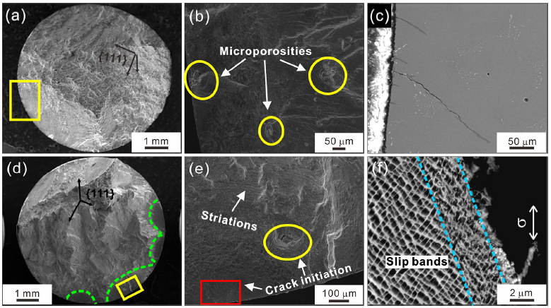 The fracture surfaces of the [111]-oriented specimens under various strain ranges at 980 °C are shown in Fig. 7. Multiple microporosities at the subsurface of the alloy promote crack initiation, the morphology indicated in yellow circular area of Fig. 7b, e. Meanwhile, the larger the number of cycles to failure is, the greater the oxidative damage of the alloy subjected to is, which results in some sites of the crack initiation being covered by the oxide layer (the areas indicated by the red box in Fig. 7e). During the cyclic loading, the surface oxide layer generates microcracks identified to propagate in a dominated slip plane (Fig. 7c). While for the strain range ∆εt/2 = 0.2%, although multiple cracks originate in several small facets perpendicular to the stress axis (the areas indicated by green dashed lines in Fig. 7d), it is noteworthy that the direction of slip bands near the fracture surface is paralleled to the fracture surface (Fig. 7f), meaning that multiple cracks spread along respective {111} slip planes. Generally, for the [111]-oriented specimens, although the (111) slip plane is perpendicular to the loading direction, the crack actually propagates along other {111} slip planes (referring to Fig. 8). The fracture surface is similar to that of the specimens with the [011] orientation but macroscopically much rougher, exhibiting the characteristic of crystallography fracture and plastic deformation mechanism of planar slip. Besides, the fatigue striations are visible near the site of the crack initiation (Fig. 7e).