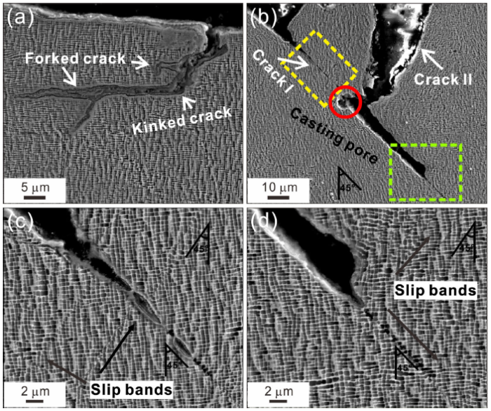 Figure 9 reveals the typical morphologies of cracks near the fracture surface on the longitudinal sections of the fatigued [001] specimens, to carry out more detailed microcosmic analysis on fatigue fracture. In Fig. 9a, the crack branch is produced by the main crack and turns toward the direction of the main crack after extending a certain distance. Previous studies [24, 25] have pointed out possible types of the crack geometry and calculated the effective stress intensity factors of the crack branch based on the stress intensity factors of the main crack. It is indicated that the crack tip is subjected to stress concentration; kinked and forked cracks can release the stress intensity and weaken the deformation around the crack tip, slowing down the crack propagation. In Fig. 9b, the secondary crack I is about 45° inclined to the loading direction, which indicates that the crack propagates on one of the octahedral slip planes, although two sets of slip traces are evident ahead of the crack tip and around the crack (Fig. 9c, d). When the cracks I and II encounter casting pores, it coalesces with the casting pores and continues to propagate along the crack I.