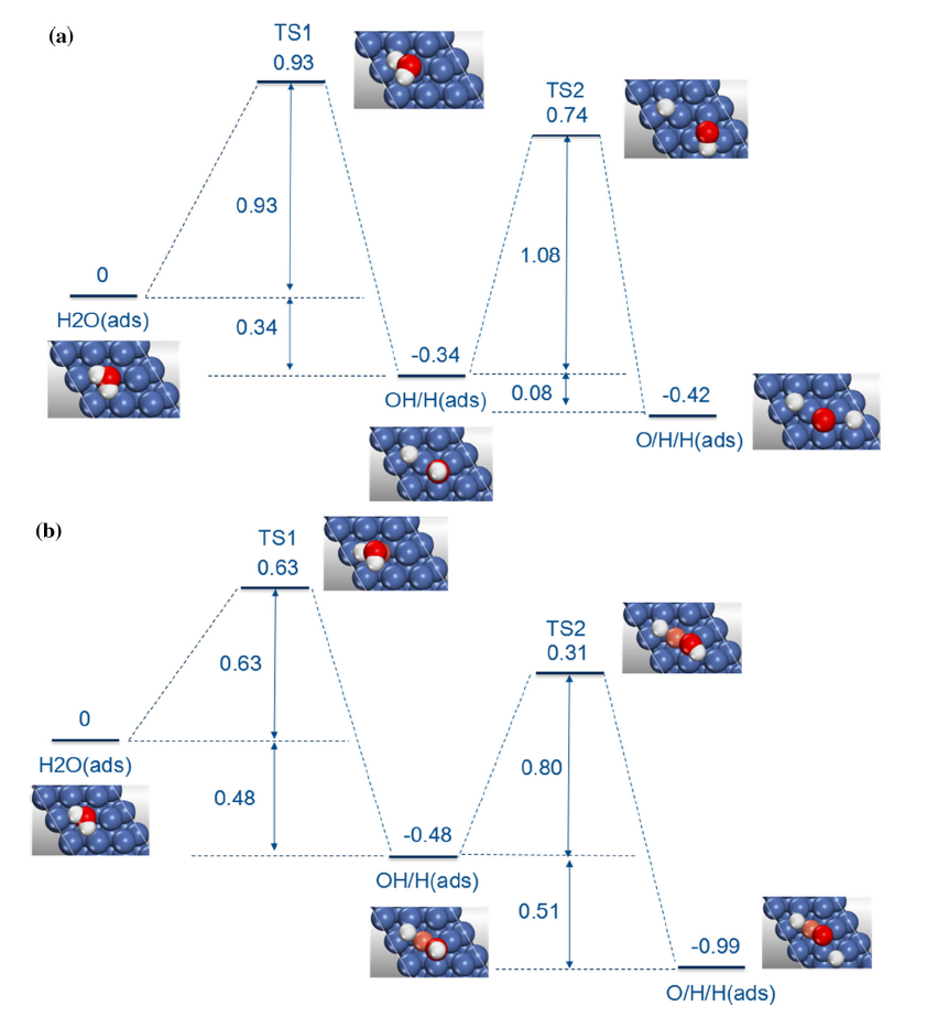 Fig. 4 Energy profile for dissociation of H2O on a Ni(111), b Ni-Cr(111) surfaces