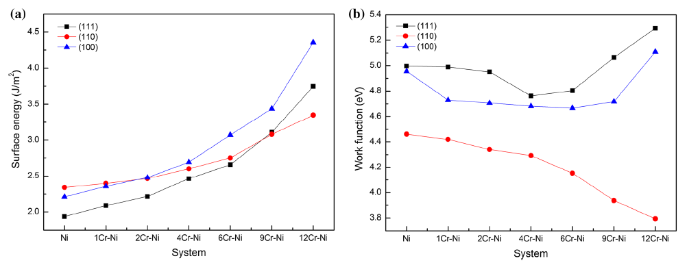As shown in Fig. 3a, the surface energies of (111), (110) and (100) surfaces increase with the increase in Cr doping amount. This can be explained by the fact that the surface energy of Cr crystal is higher than that of Ni crystal; therefore, the surface energy of Ni-Cr binary alloy will increase as the doping amount increases. The changes in surface energies of (111) and (100) are confirmed to the identical law, whereas the surface energy of (110) changes significantly lower than those of the other two surfaces. At the beginning, the surface energies of (111), (100) and (110) are 1.94, 2.21, 2.34 J/m2, respectively, which are close to the previous calculation results of 2.01, 2.43 and 2.37 J/m2 [22]. Subsequently with the increase in Cr composition, the surface energies of (111) and (100) gradually exceed that of (110). Finally, when the Ni atoms in the top surface layer are completely substituted by Cr atoms (12 Cr atoms), the surface energy of (110) becomes the lowest among three surfaces, which is 3.35 J/m2, whereas the surface energy of (111) increases to 3.75 J/m2 and the surface energy of (100) becomes the largest, reaching 4.35 J/m2.