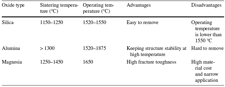 Ceramic cores are widely used in hollow shape casting of alloy blades, which need to satisfy certain requirements like dimensional conformity, moderate mechanical strength, good thermal stability and gas permeability [1, 2]. A hard and wear resistant surface is required to retain the high-strength behavior of the ceramic core [3, 4]. To satisfy these properties, ceramic cores are usually composed of silica, alumina or magnesia [5]. The detailed data are listed in Table 1 [6]. Among these materials, alumina has been widely used due to its high melting point, high hardness, and excellent wear and corrosion resistance [7]. For silica-based ceramic cores, the sintering shrinkage needs to be as low as 1% and the flexural strength should be 10-40 MPa in order endure the high thermal load [8]. The ceramic cores are usually a compromise in order to produce hollow, precise cooling structures with complex shapes inside the casting [9]. The open porosity of the ceramics should be higher than 20% to allow chemical dissolution by NaOH or HF solutions after casting [10]. It should also be easily removed by a process that is not harmful to the metal [11]. The ceramic core used for forming internal cooling structure plays an essential role during the casting of hollow turbine blades [12].