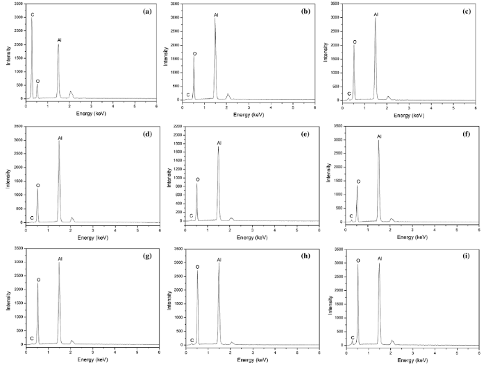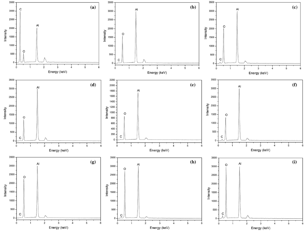 where d is the average crystallite size of Al2O3 (nm), K is the Scherrer constant (0.89 in the present case), λ is the wavelength of X-ray (0.154056 nm), and B is the peak width at half height of Al2O3. The Raman test of the samples was measured on a Confocal Raman Microscope Systems (Alpha300R, WITec) with a laser source of 532 nm, power of 50 mW, and slit width of 50 μm. X-ray photoelectron spectroscopy (XPS) was performed using an Axis Supra (Shimadzu) photoelectron spectrometer. Scanning electron microscope (SEM) image was obtained from Helios G4 CX (FEI Corporation). Energy-dispersive spectroscopy (EDS) was also conducted. Transmission electron microscopy (TEM) image was obtained from Tecnai G2 F20 (FEI Corporation).