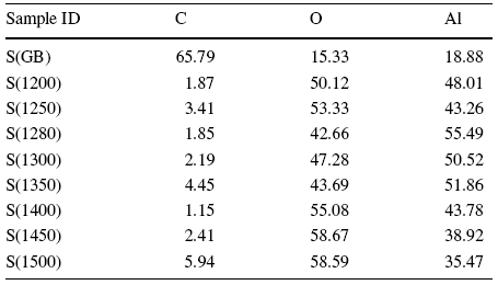 The elemental analysis acquired from EDS shows that all the samples all contained of C, O and Al, as shown in Fig. 9. These results are consistent with the phase composition acquired from XRD. The element contents are shown in Table 2. In the sample of green body, there is much higher C content than those of others because of the photosensitive resin remnants in the sample. After sintering, the C, Al and O contents in different samples do not exhibit large changes. This demonstrates that the sintering temperature only has a minor influence on the elemental composition.