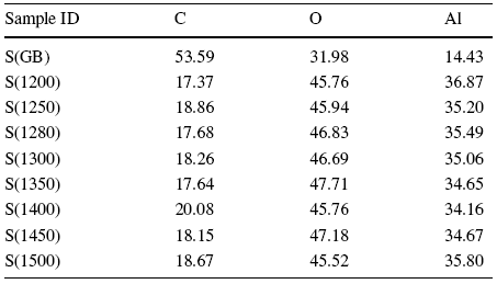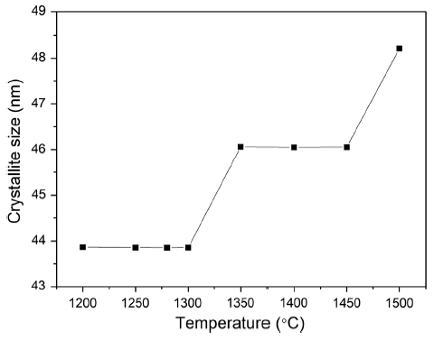 The Al2O3 crystallite size calculated by Scherrer equation from XRD results is shown in Fig. 8. The crystallite size increased from 43.9 to 48.2 nm as the sintering temperature increased from 1200 to 1500 °C. According to the following empirical formula, it is known that the crystallite size increases with the increase in temperature,