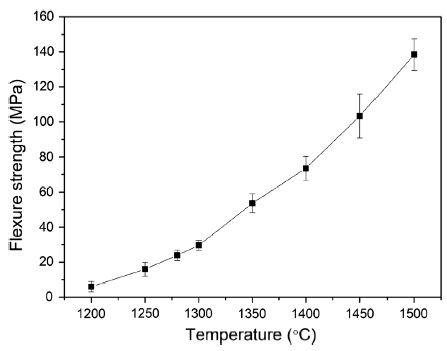The flexure strength of the samples sintered at different temperatures is shown in Fig. 11. The sample achieved the minimum flexure strength of 6.0 MPa after sintering at 1200 °C. The flexure strength gradually increased with the increase in sintering temperature until it reached a value of 138.5 MPa after sintering at 1500 °C. After sintering at 1280 °C, the flexure strength was 24.0 MPa. Compared with results of Jiang et al. [43], the strength of alumina core sintered at 1300 °C and 1400 °C is 20 MPa and 24.8 MPa, which is slightly lower than our results. Generally, measures such as eliminating large cracks and voids, increasing the relative density, reducing impurities in ceramics, making the crystallite size small and uniform and increasing grain boundary bonding strength serve to improve the flexure strength of the alumina ceramics [44]. The decrease in open porosity and the increase in bulk density with the increasing sintering temperature generate the stronger adhesion among particles which lead to greater flexure strength.
